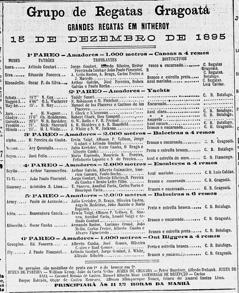Ainda em 1895, no dia 15 de dezembro, o Grupo – a mudança para Clube viria sete anos depois – de Regatas do Flamengo participou de sua primeira competição, um evento organizado pelo clube Gragoatá, em Niterói. Na prova, a embarcação Scyra teve como patrão José Félix da Cunha Menezes e os remadores Nestor de Barros, Felisberto Laport, Mario Spínola e Mauricio Rodrigues Pereira.